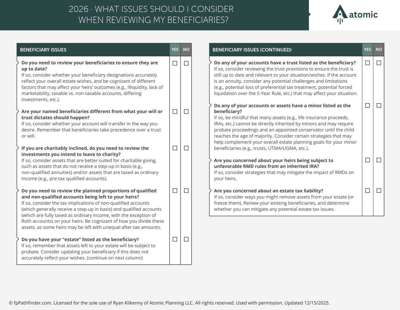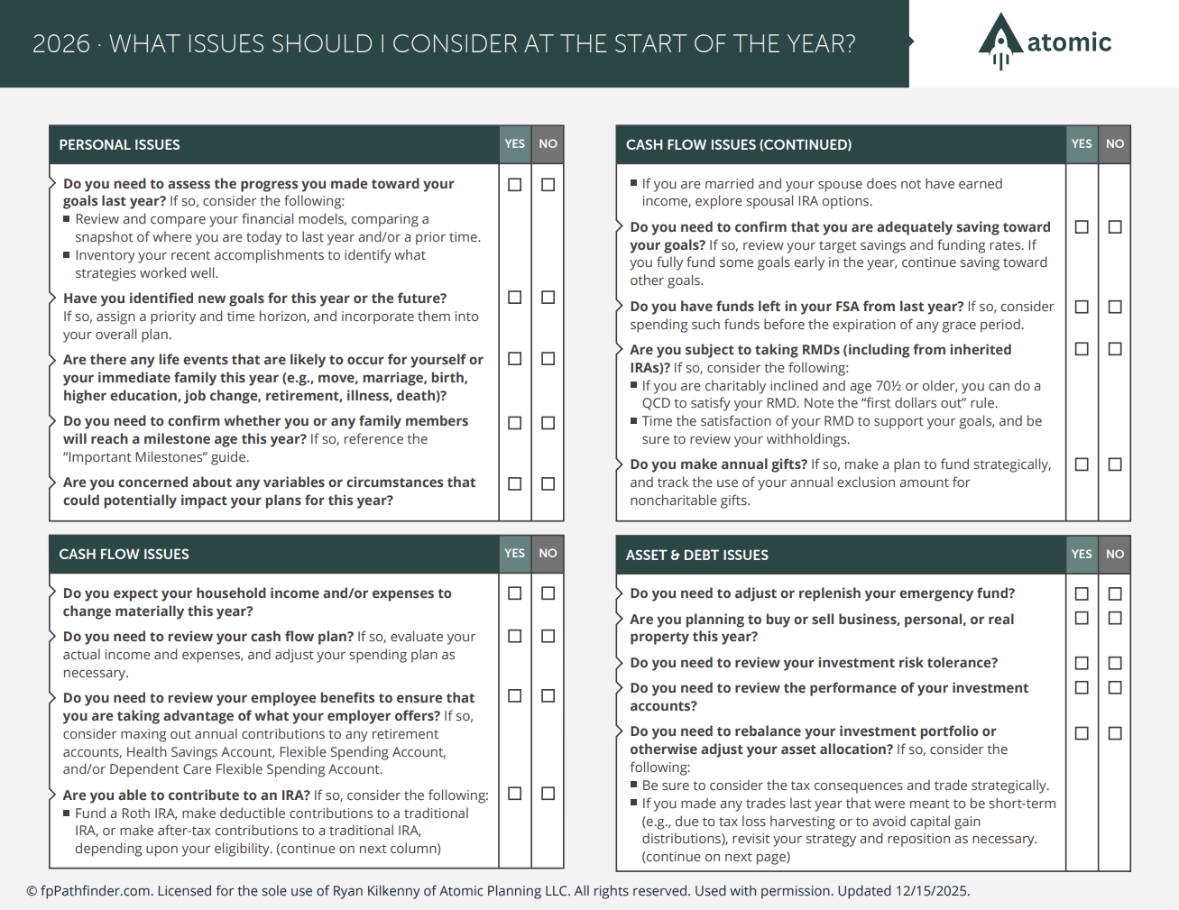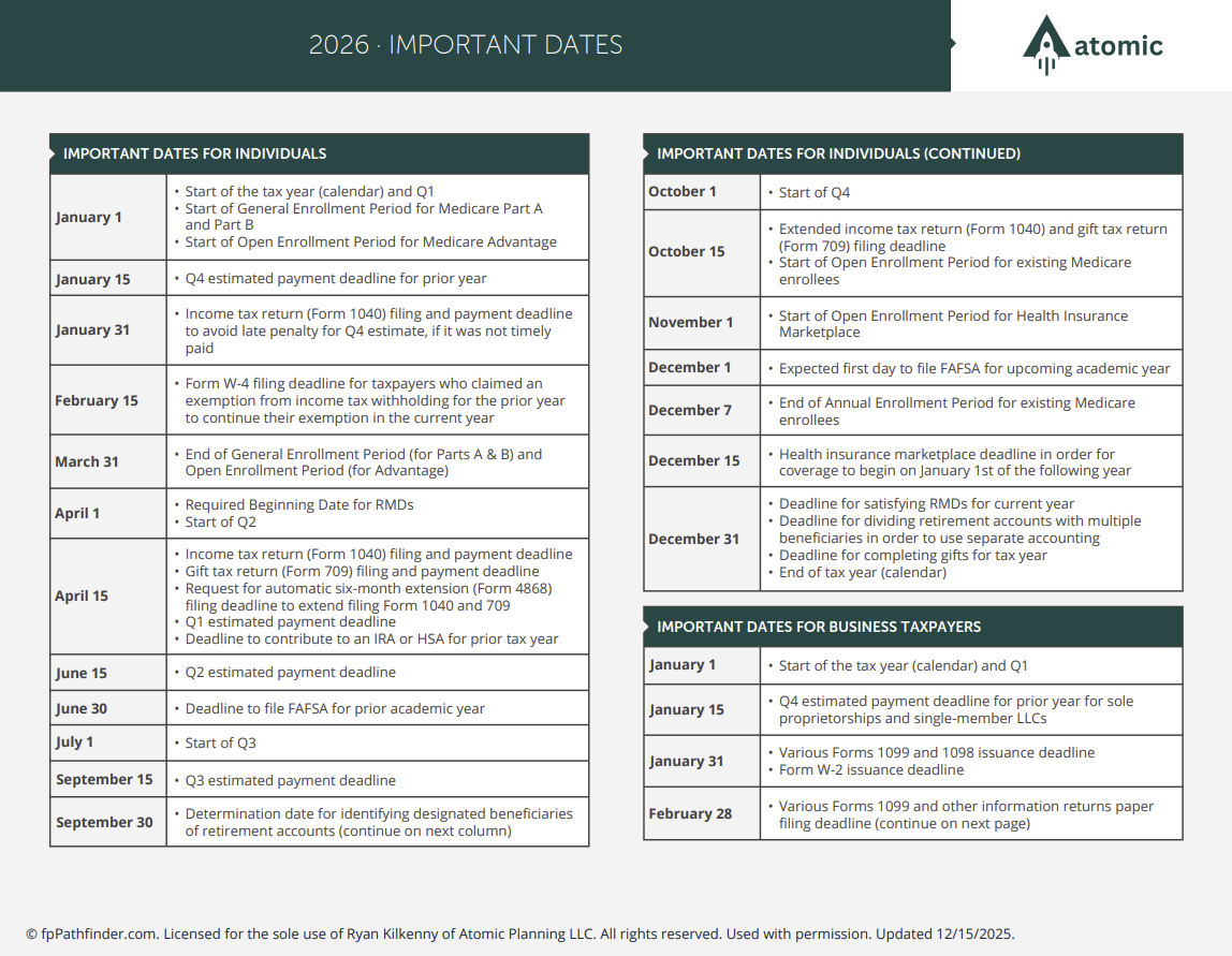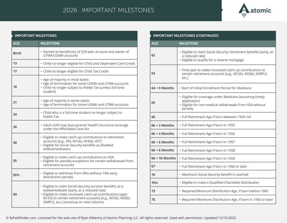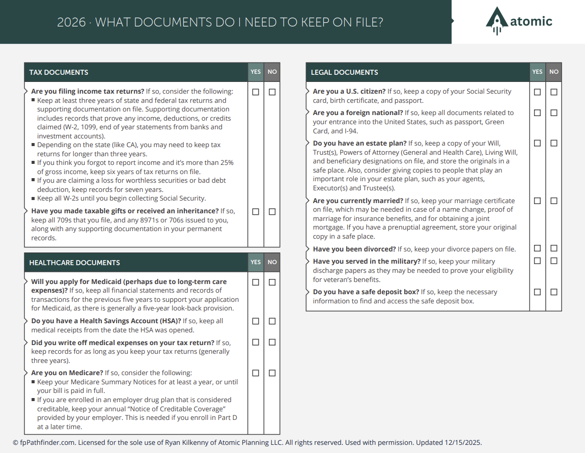 Guides Helpful financial planning guides, checklists, and flowcharts. Important Numbers 2026 Important Numbers 2025 Important Dates Important Milestones What Documents Do I Need to Keep on File? End of Year Checklist Pay Stub Review What Issues Should I Consider At The Start Of The Year? What Accounts Should I Consider to Save More? What Documents Do I Need To File My Tax Return? What To Consider When Reviewing Beneficiaries Should I Consider a Roth Conversion? Moving 529 Plan Dollars to a Roth IRA