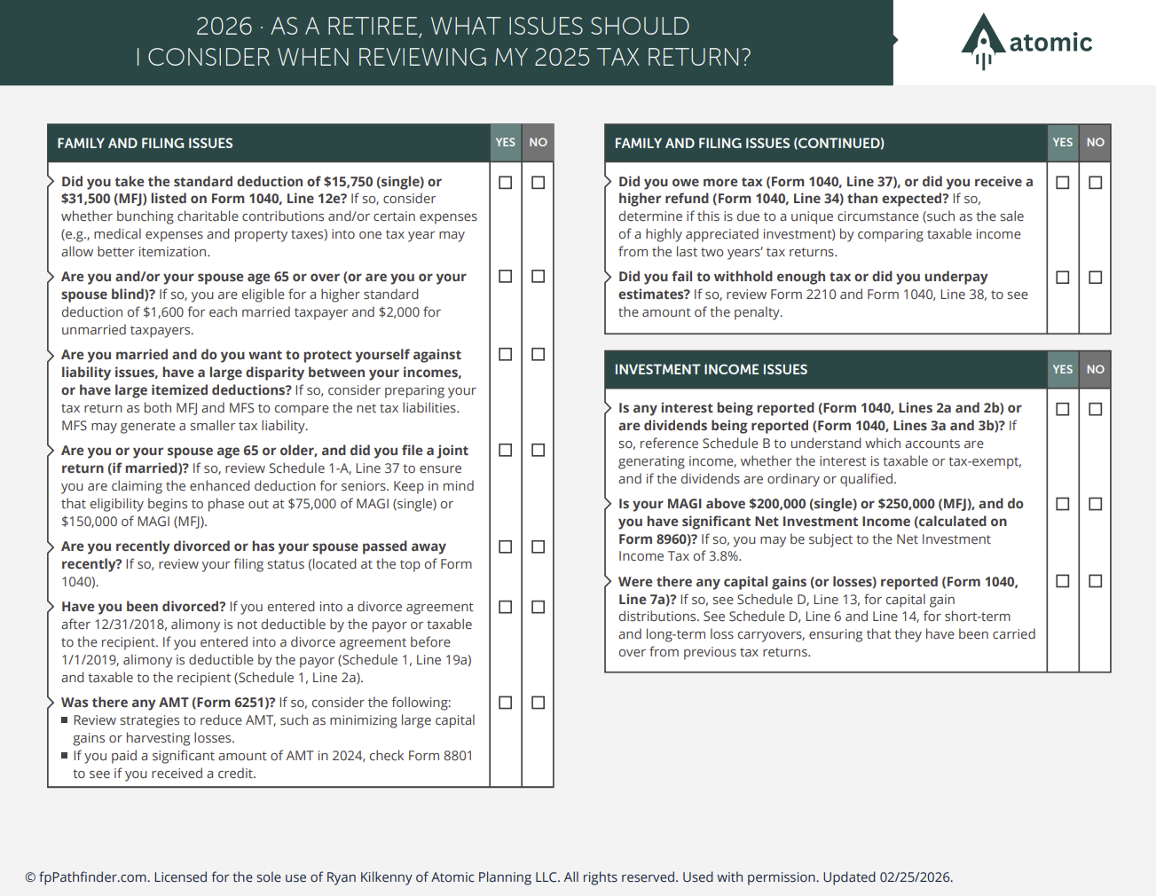 Free Retirement Planning Guides and Resources Helpful financial planning guides, checklists, and flowcharts. Important Numbers 2026 Important Numbers 2025 Important Dates Important Milestones What Documents Do I Need to Keep on File? End of Year Checklist Pay Stub Review What Issues Should I Consider At The Start Of The Year? What Accounts Should I Consider to Save More? What Documents Do I Need To File My Tax Return? What To Consider When Reviewing Beneficiaries Moving 529 Plan Dollars to a Roth IRA Should I Consider a Roth Conversion? The One Big Beautiful Bill Act (OBBBA) Comparison Guide Roth IRA Distribution Rules Tax Return Review (Retired) Tax Return Review (Still Working) Can I Make a Deductible HSA Contribution? AGI/MAGI Summary Guide Roth IRA or Traditional IRA?